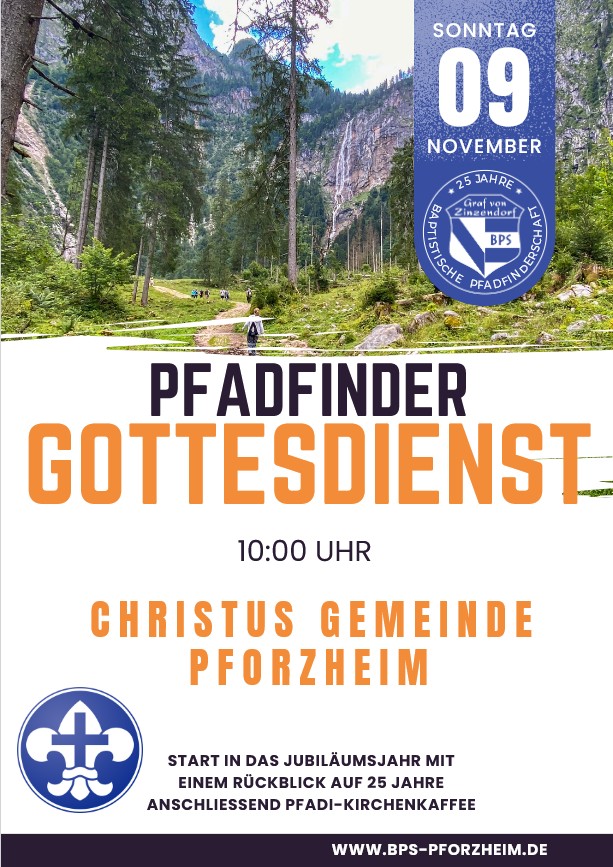 Am Sonntag, den 9. November 2025 um 10:00 Uhr, lädt die Christus Gemeinde Pforzheim herzlich zum Pfadfinder-Gottesdienst ein – ein besonderer Anlass, denn wir starten gemeinsam in das Jubiläumsjahr: 25 Jahre Pfadfinderarbeit!